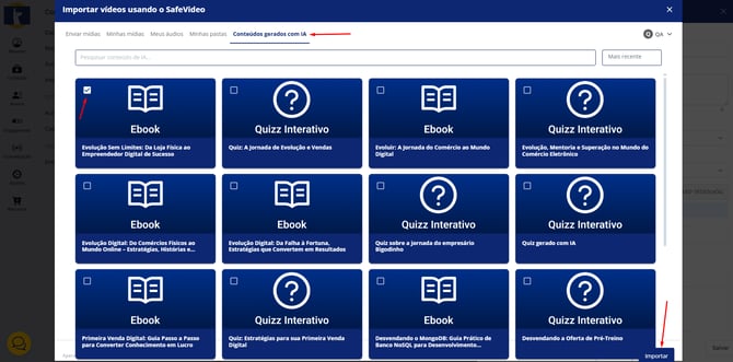 3. Em sua conta SafeVideo,, clique na aba ”Conteúdos gerados com IA” e, em seguida, selecione o conteúdo E-book desejado e clique em “Importar”:
