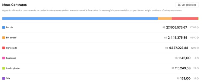 Para cada status, são exibidos o valor financeiro total, a quantidade de contratos e o link para acessar a lista completa.