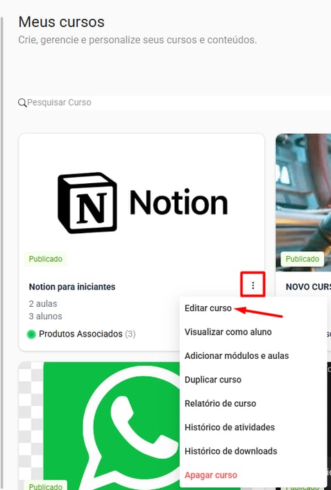 2. Clique no ícone três pontos e selecione a opção "Editar curso":