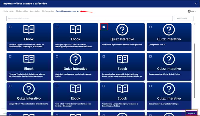 6. Clique na aba “Conteúdos gerados com IA”, selecione o quiz desejado e clique em “Importar”: