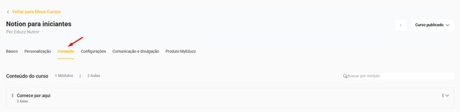 3. Clique na aba "Conteúdo" e abra o módulo da aula que deseja adicionar um e-book: