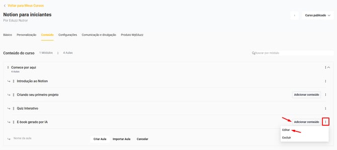 4. Clique no ícone três pontos e selecione a opção "Editar" ou clique no botão "Adicionar conteúdo" da aula: