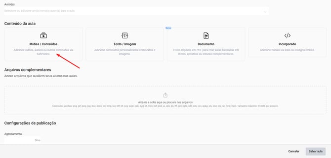 5. Em Conteúdo da aula, clique no tipo de conteúdo "Mídias / Conteúdos" e em "Selecionar conteúdo":