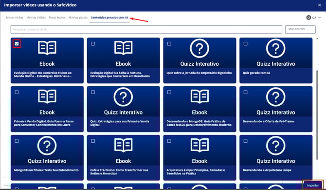 6. Clique na aba “Conteúdos gerados com IA”, selecione o e-book desejado e clique em “Importar”: