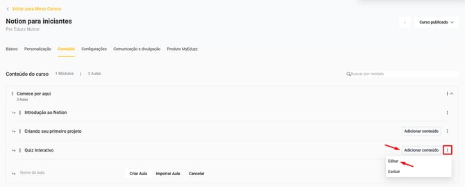 4. Clique no ícone três pontos e selecione a opção "Editar" ou clique no botão "Adicionar conteúdo" da aula: