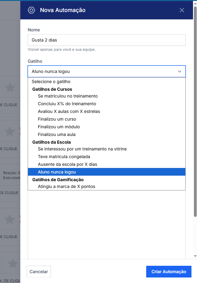 As automações podem ser disparadas por diferentes tipos de gatilho, de acordo com o comportamento do aluno.