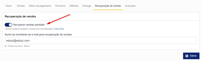 Acesse a edição do seu produto, vá até a aba "Recuperação de vendas" e ative o botão de recuperação de vendas perdidas**:**