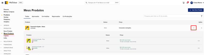 Acesse o menu "Produtos > Meus Produtos", escolha e clique nos três pontos: