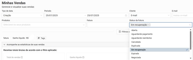 No filtro superior, selecione o campo “Status” marque a opção “Em Recuperação”;