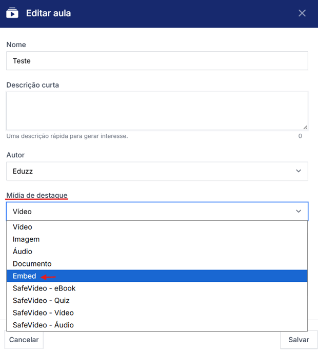 A opção Embed permite inserir conteúdos externos diretamente dentro de uma aula, por meio de uma URL de incorporação (embed).