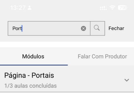 Vá em "Módulos" e para localizar um módulo ou aula específico já dentro do curso, toque na lupa na parte superior e digite o módulo/aula que deseja encontrar dentro do curso: