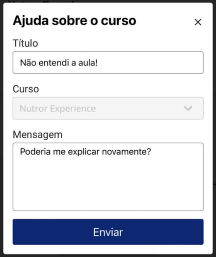 Toque no botão "Ajuda sobre o curso", insira um título para sua mensagem e depois escreva sua dúvida. Por último, toque em "Enviar":