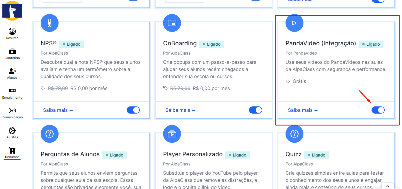 Na loja de "Recursos", ative o plugin "PandaVideo":