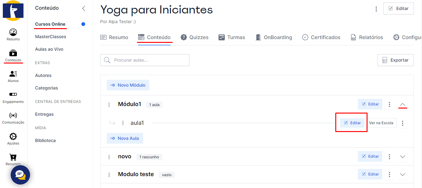 Para edição ou criação o passo a passo é o mesmo, basta ir nas configurações da aula. Assim que selecionar a aula, clique em "Editar":