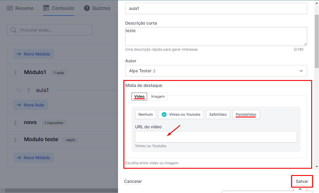 Desça ate a área de "Mídia de destaque", selecione o botão "PandaVideo" e cole o link do vídeo na área indicada abaixo. Assim que finalizado, salve todo processo clicando no botão "Salvar":