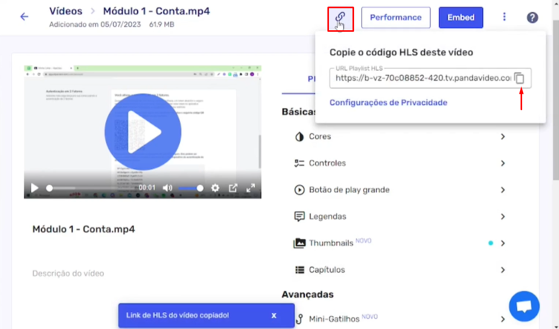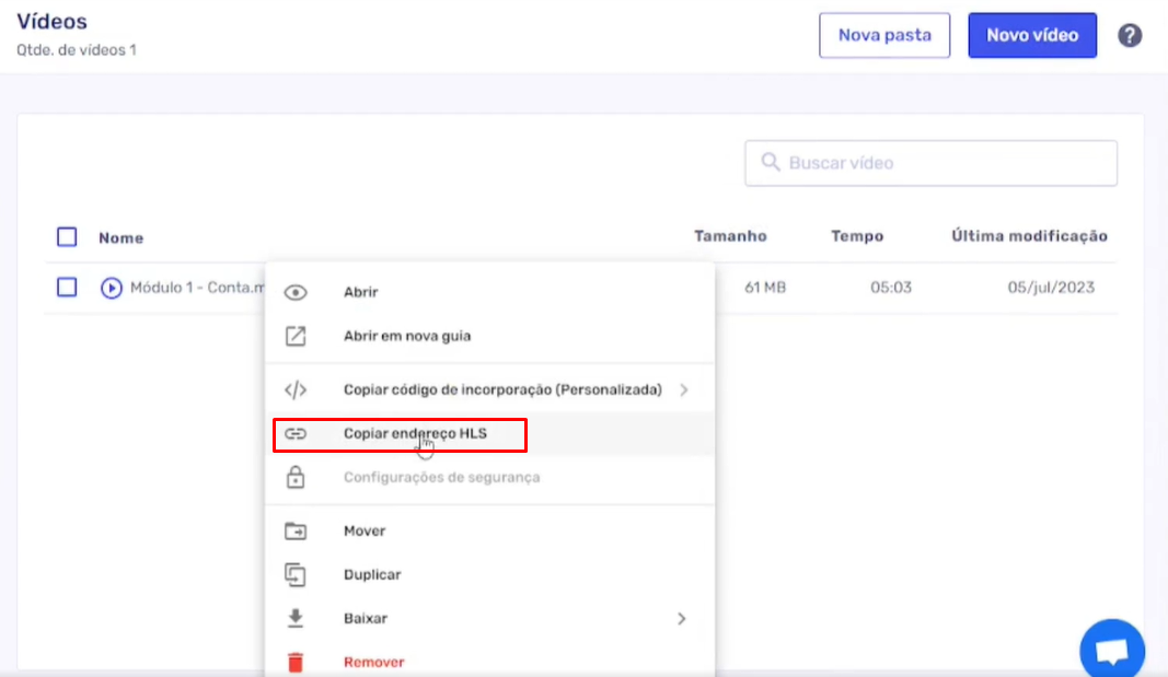 Na sua conta do PandaVideo, clique com o botão direito na aula que deseja copiar a URL e em "Copiar endereço HLS":