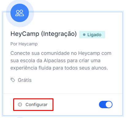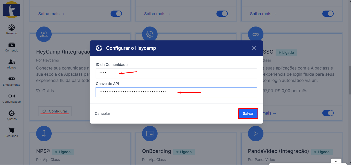 5 (1).pngAgora, dentro da AlpaClass, cole as informações de "ID da Comunidade" e "Chave do API", na área de "Configurações", no plugin do HeyCamp e clique no botão "Salvar":