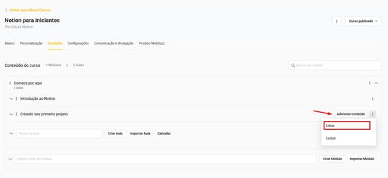 - Clique no ícone três pontos e selecione a opção "Editar" ou clique no botão "Adicionar conteúdo" da aula: