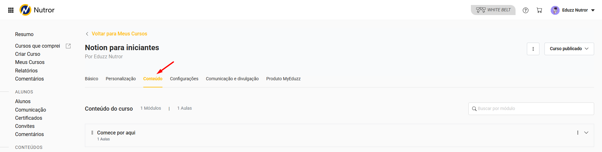 - Clique na aba "Conteúdo" e, em seguida, abra o módulo da aula que deseja adicionar um vídeo do Vimeo: