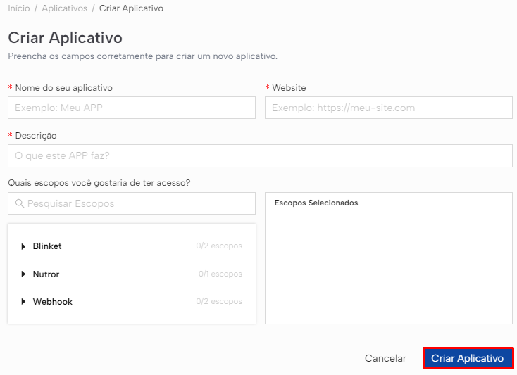 Preencha todos os campos obrigatórios e selecione os escopos que seu aplicativo irá utilizar. Após, clique em "Criar Aplicativo":