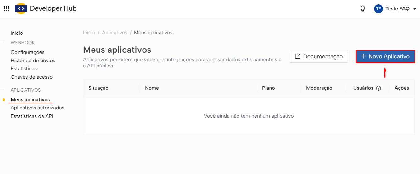 Na aba "Meus aplicativos", clique no botão "+ Novo Aplicativo":