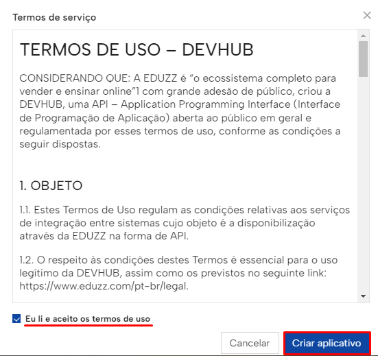 Leia com atenção os Termos de Serviço, aceite, caso esteja de acordo, e então clique em "Criar aplicativo":