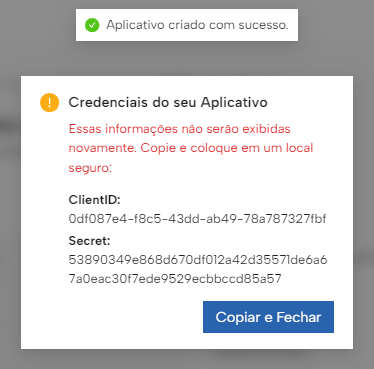 Ao receber a confirmação de que seu aplicativo foi criado, clique em "Copiar e Fechar" para copiar suas credenciais: