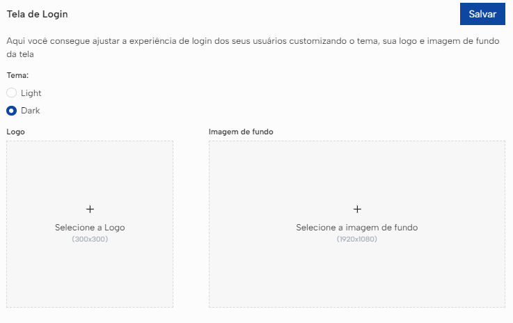 Você pode customizar o tema, logo e imagem de fundo, caso deseje. Após realizar as alterações, basta clicar em "Salvar".