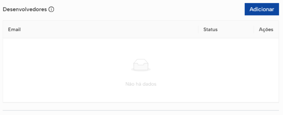 Na sessão "Desenvolvedores", você pode adicionar até 5 desenvolvedores para terem acesso e se autenticarem no aplicativo enquanto ele estiver com status "Em desenvolvimento". Para cadastrar, basta clicar em "Adicionar" e preencher com o e-mail do desenvolvedor. Um convite será enviado ao mesmo.