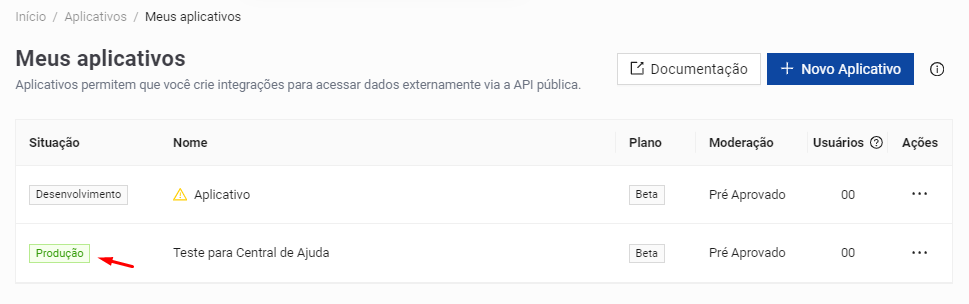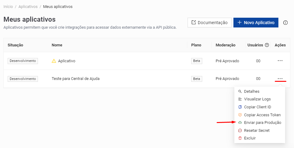 Na tela Meus aplicativos, clique no botão de ação (três pontos) do aplicativo que deseja e então em "Enviar para Produção":