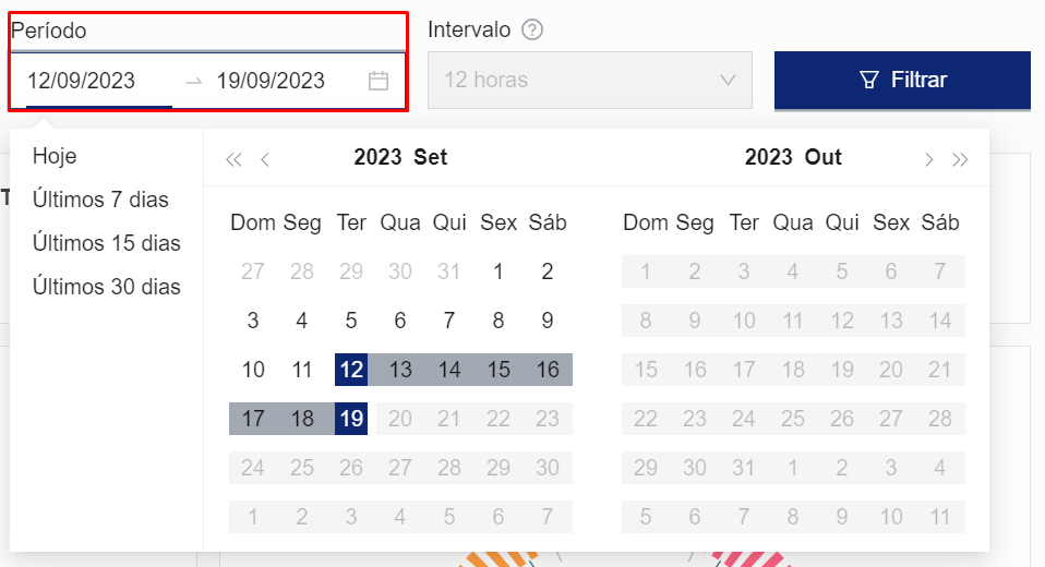 No campo Intervalo, você pode filtrar por minutos e horas APENAS quando o filtro de período está configurado para HOJE: