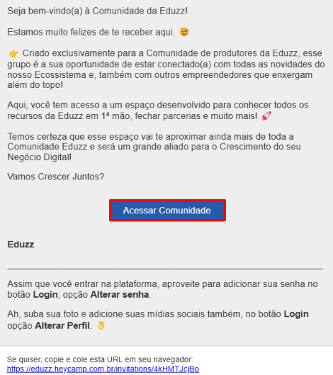 Localize o e-mail HeyCamp, leia o e-mail atentamente e em seguida, clique sobre o botão "Acessar Comunidade".