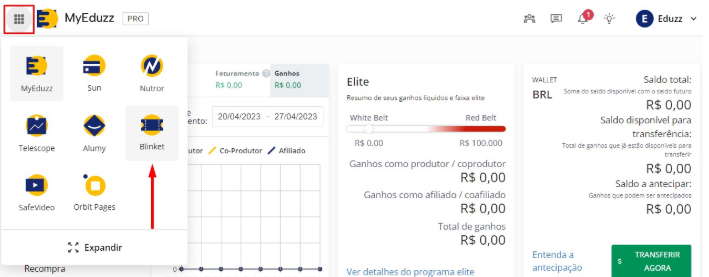 Acesse sua conta MyEduzz, clique no menu de produtos e depois em "Blinket":