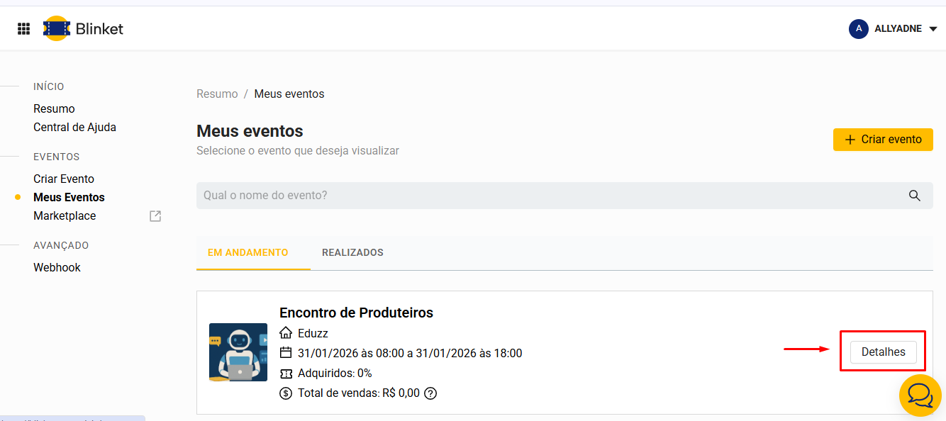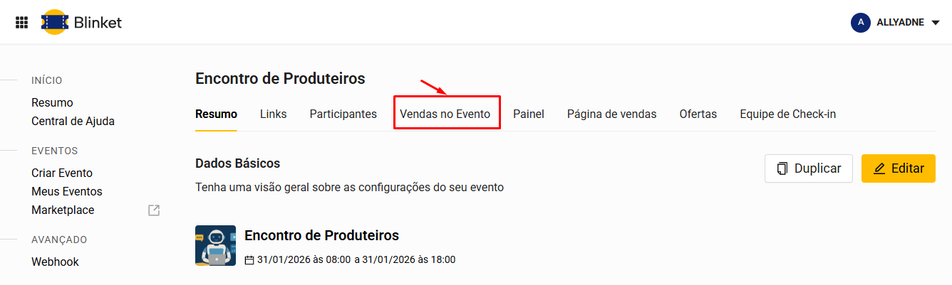 Acesse os detalhes do seu evento na Blinket e clique em "Vendas no Evento".