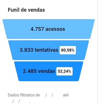 💡Funil de vendas: apresenta o caminho percorrido pelos usuários no checkout, desde o acesso até a confirmação da compra. Use esses dados para entender gargálos no funil e otimizar sua taxa de conversão. Você verá: