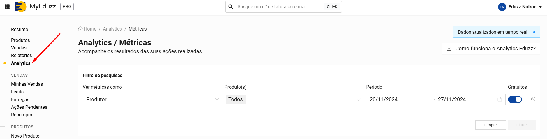 Entre no painel do MyEduzz e no menu principal, clique em "Analytics" e depois em "Métricas":