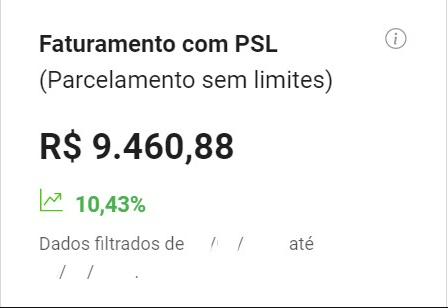💡 Faturamento com PSL (Parcelamento sem Limites): analisa o resultado total dos valores a receber por Parcelamento Sem Limites, ou seja, é feita uma busca de todas as vendas feitas por PSL dentro do período selecionado e então somado o valor das parcelas futuras, resultando no saldo total a essa modalidade.