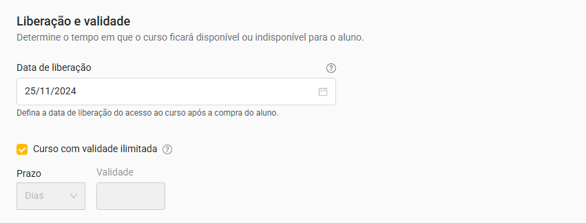 - Data de liberação: Define uma data de liberação específica para liberar o acesso ao curso após a compra do aluno.