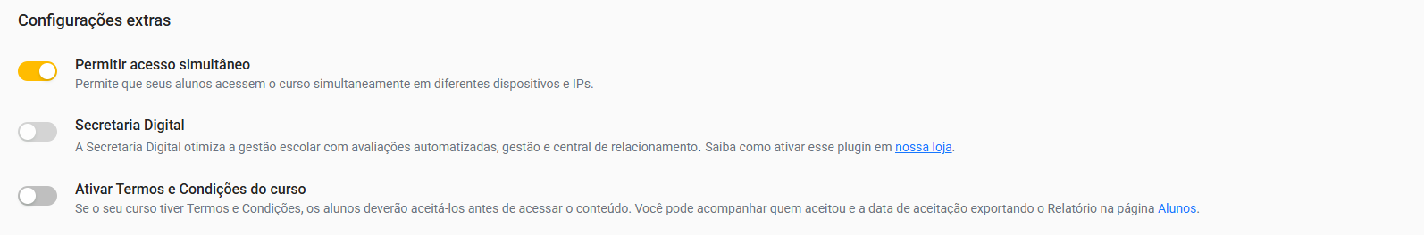 - Permitir acesso simultâneo: Permite que seus alunos acessem o curso simultaneamente em diferentes dispositivos e IPs. Ative gratuitamente esse plugin na Loja de Plugins.