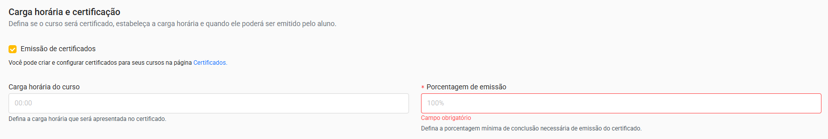 - Emissão de certificados: Se marcada essa opção, os campos a seguir serão habilitados para definição da carga horária do curso e porcentagem mínima de conclusão para emitir o certificado.