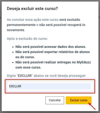 - Confirme a exclusão digitando a palavra "EXCLUIR" no campo de texto e clique no botão Excluir curso: