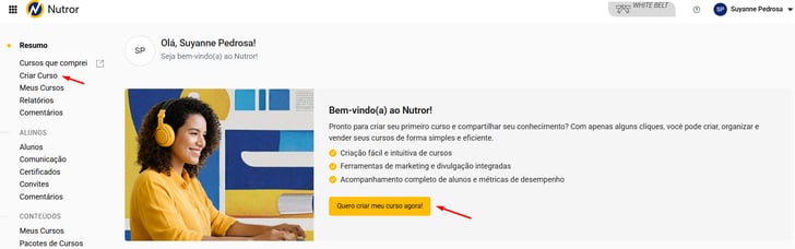 - Na tela de inicio, clique em "Criar Curso" ou "Quero criar meu curso agora!" para iniciar a jornada de criação do seu curso:123