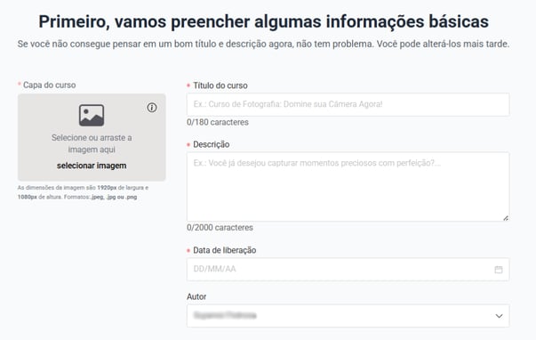 - Capa do curso: Adicione uma imagem que será utilizada como capa do seu curso. Essa será a imagem visualizada pelos seus alunos.
