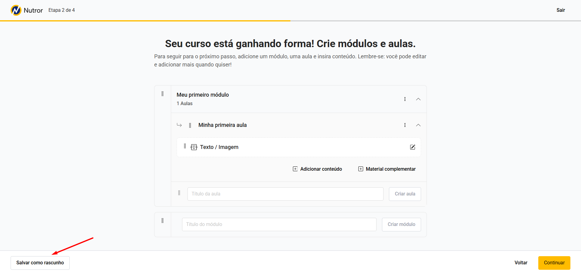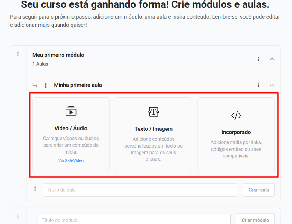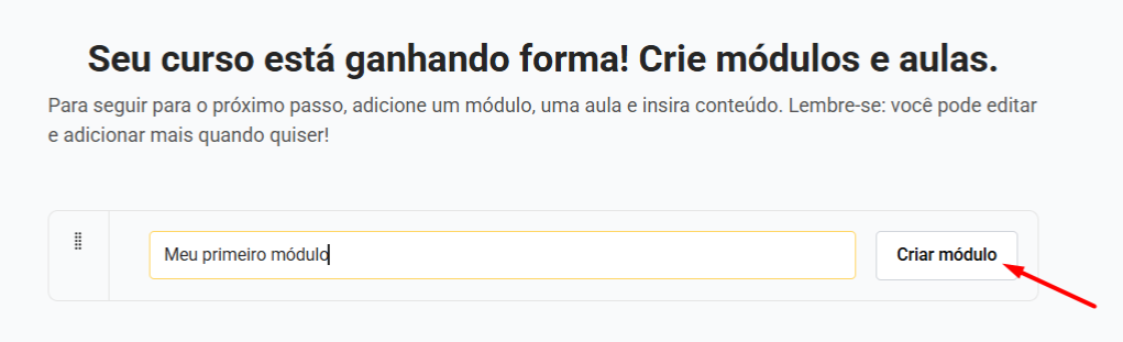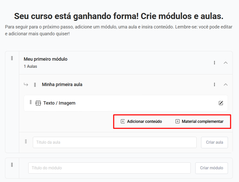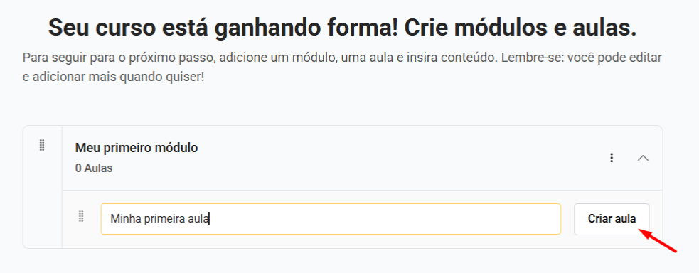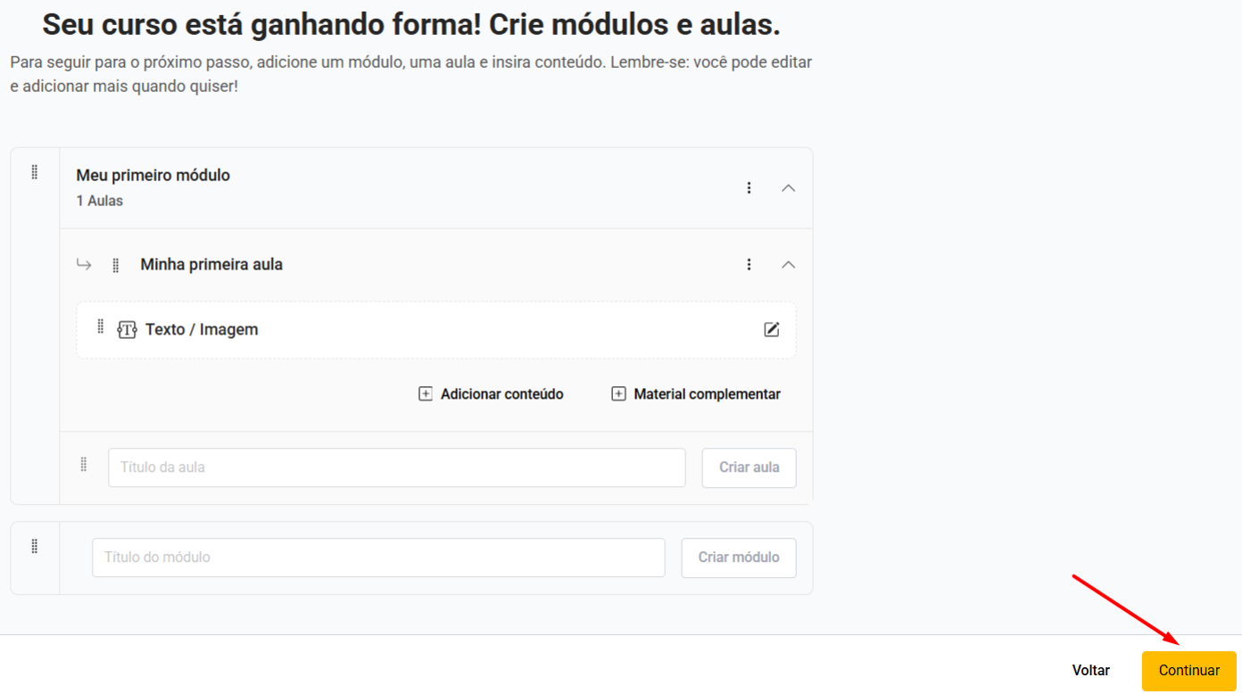 - Depois de criar o seu primeiro módulo e aula, você poderá avançar para a próxima etapa.