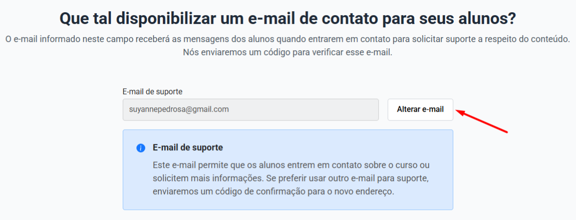 É necessário informar um e-mail de suporte para que seus alunos possam entrar em contato em caso de dúvidas ou solicitações de ajuda.