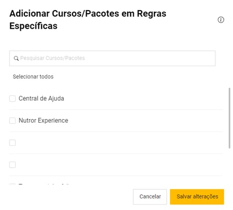 Em Regras Específicas lembre-se de selecionar os cursos que terão as permissões, clique no botão Adicionar Cursos/Pacotes. Após a seleção dos cursos, basta salvar as alterações: