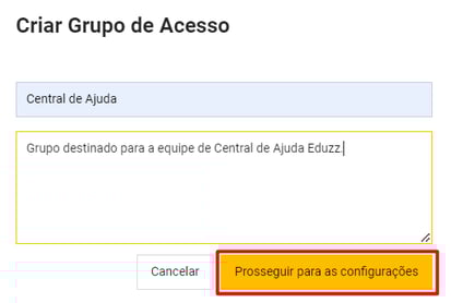 Insira o nome e a descrição do grupo a ser criado. Ao finalizar, clique em "Prosseguir para as configurações":