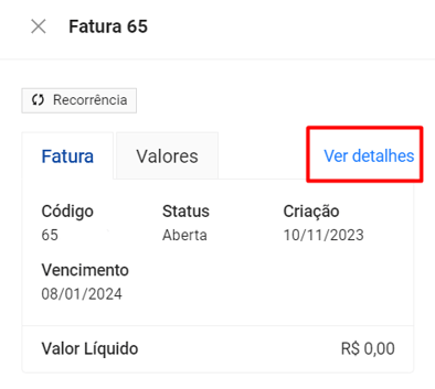 - Acesse os 3 pontinhos da fatura em aberto e, no menu lateral, clique em "Ver Detalhes" no canto superior direito: