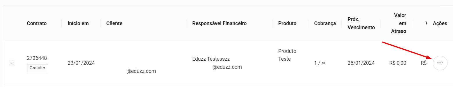 Dica: No filtro da aba “Período“ coloque uma data antiga, assim poderá filtrar todos os contratos ativos. - Confira se o contrato em atraso se trata de um contrato por cartão de crédito ou boleto, clicando nos 3 pontinhos a direita do contrato. O tipo de pagamento será exibido no campo "Forma de pgto":
