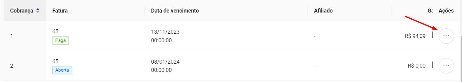 - Acesse os 3 pontinhos da fatura em aberto e, no menu lateral, clique em "Cobrar Novamente":